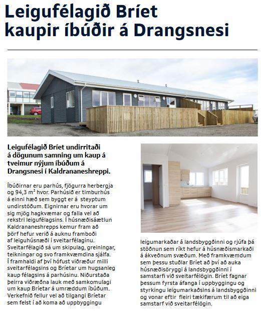 Leigufélagið Bríet kaupir tvær nýjar íbúðir á Drangsnesi (2020) Glugginn, Fréttabréf Húsnæðis- og mannvirkjastofnun, 4. tbl. 2020. Vefslóð sótt 14.9.2020: