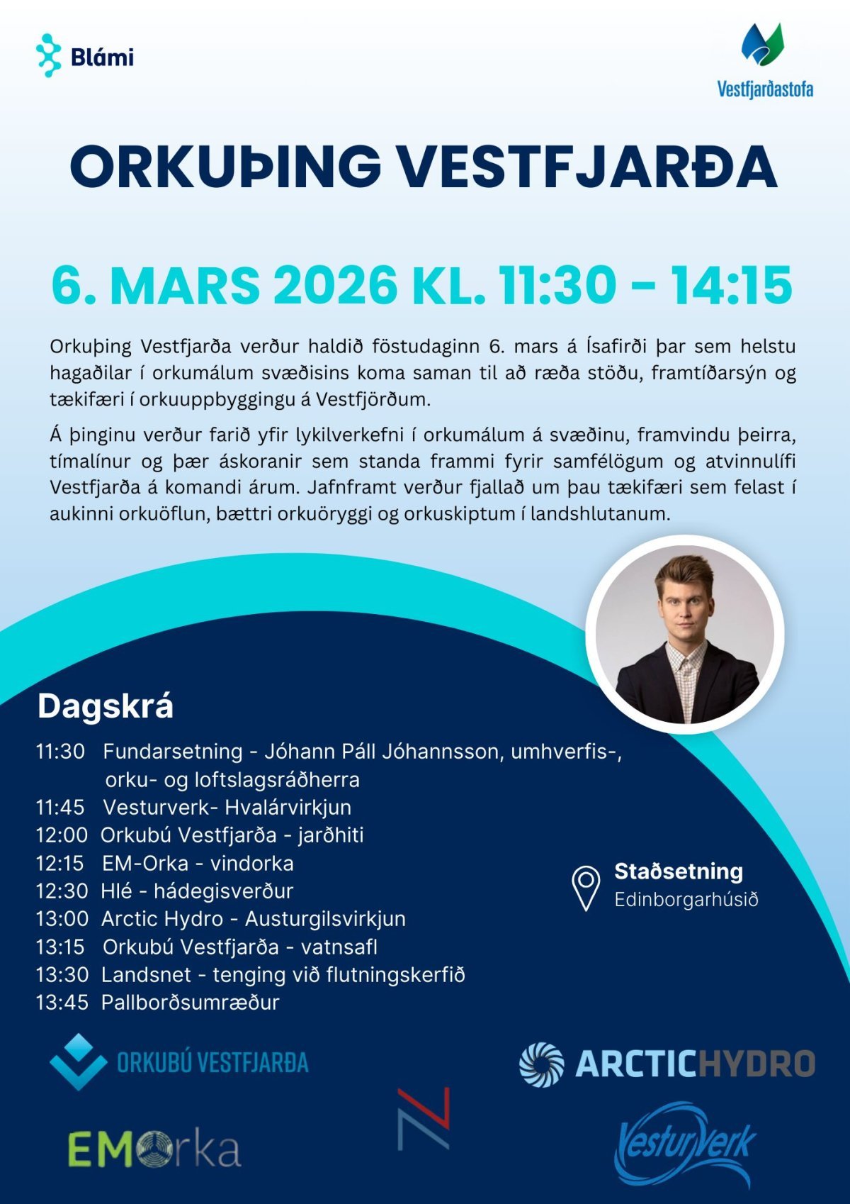 Orkuþing Vestfjarða verður haldið föstudaginn 6. mars á Ísafirði þar sem helstu hagaðilar í orkumálum svæðisins koma saman til að ræða stöðu, framtíðarsýn og tækifæri í orkuuppbyggingu á Vestfjörðum.